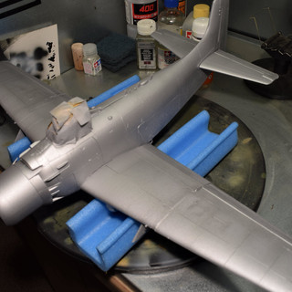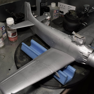 Once the majority of the aircraft main body was assembled, I gave the model an ISO bath to remove chemicals and greasy fingerprints. I primed the model using Tamiya's excellent Fine Grey rattle-can Surface Primer. Some pre-shading was airbrushed applied next using ISO-thinned Tamiya XF-69 NATO Black at a 50:50 ratio. Since my Skyraider is to look worn and heavily-used, I decided to try out the famous "Hair Spray Chipping Technique" on this model. I applied a base coat of Tamiya's TS-17 Gloss Aluminum over the entire plane and once dried, using TRESemme Lvl3 hairspray, coated the model with a few thin coats and let it dry (I sped this up via a hair dryer on high-heat). Notice the subtle pre-shading showing through the Aluminum acft skin as planned.